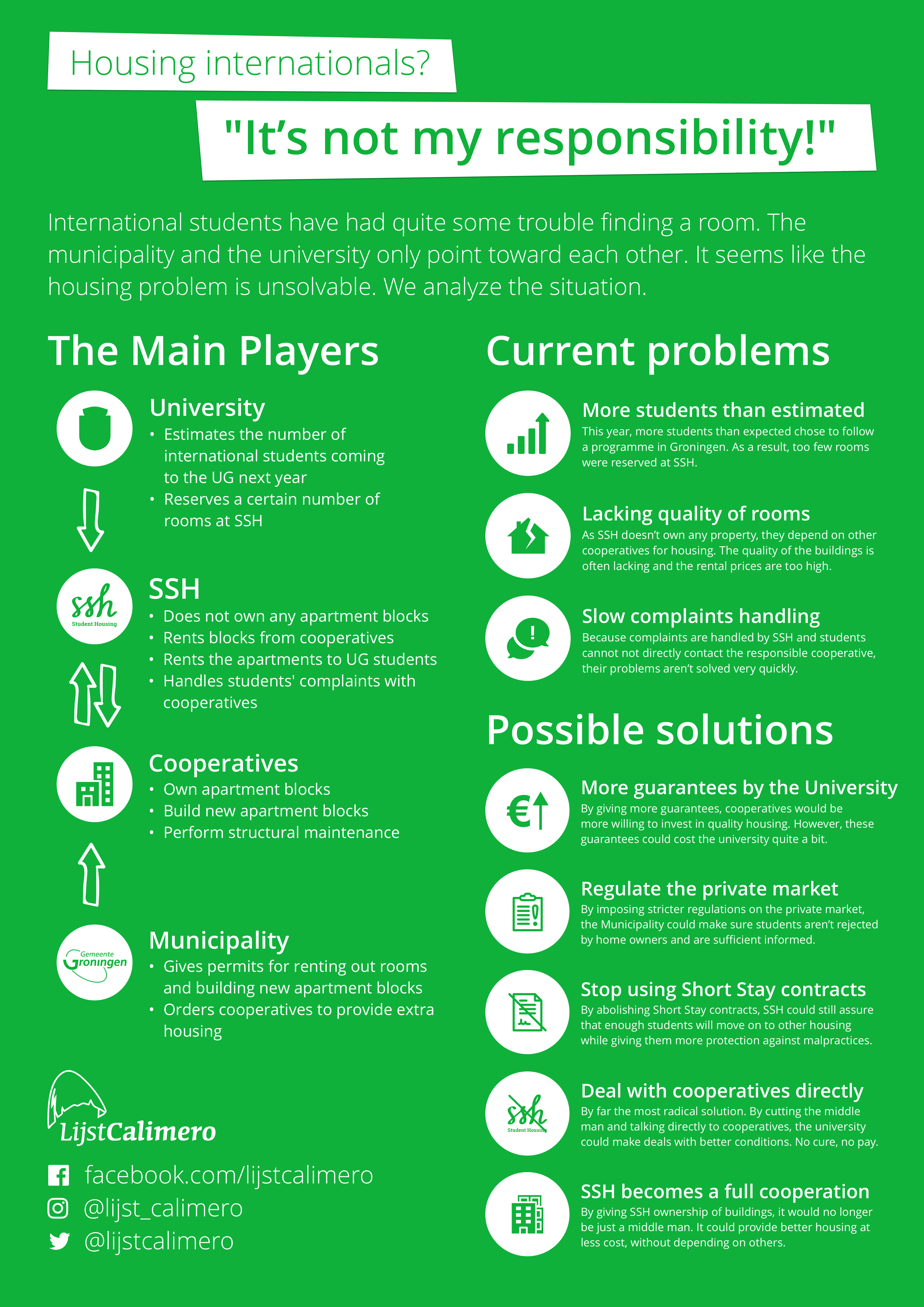 Je hebt er vast wel iets van meegekregen: problemen met de huisvesting van internationale studenten. De Gemeente en de universiteit die elkaar verwijten maken: Iedere partner in dit geheel werpt de verantwoordelijkheid van zich af. Niemand lijkt het probleem te kunnen oplossen. Maar hoe zit het nu precies? Wie is nou verantwoordelijk voor het probleem? Wij bespreken elke hoofdrolspeler in dit dossier. Met voor de beeldvorming een mooie infographic waarin het allemaal uitgetekend is. En als kers op de taart onze ideeën over mogelijke oplossingen voor dit probleem. Zet je schrap want het is een complex dossier, maar zeker wel de moeite waard!