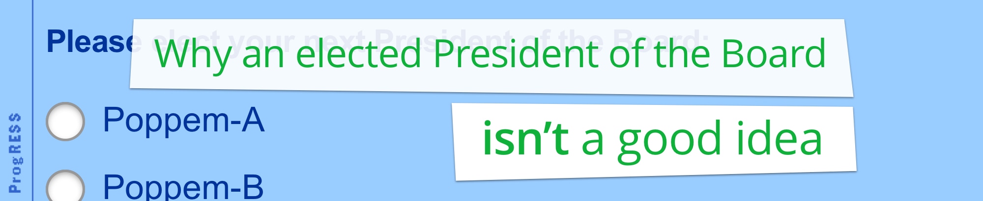 Eén van de opties die werd voorgesteld was een combinatie: een kandidaatstellingscommissie selecteert een beperkt aantal kandidaten, waarna een verkiezing plaatsvindt. Dit is wat ons betreft worst of both worlds, aangezien zo’n commissie vergelijkbare kandidaten naar voren zal schuiven: De verkiezing zou dan slechts een keuze zijn tussen Poppem-A, Poppem-B en Poppem-C, zonder duidelijke inhoudelijke verschillen tussen de kandidaten.